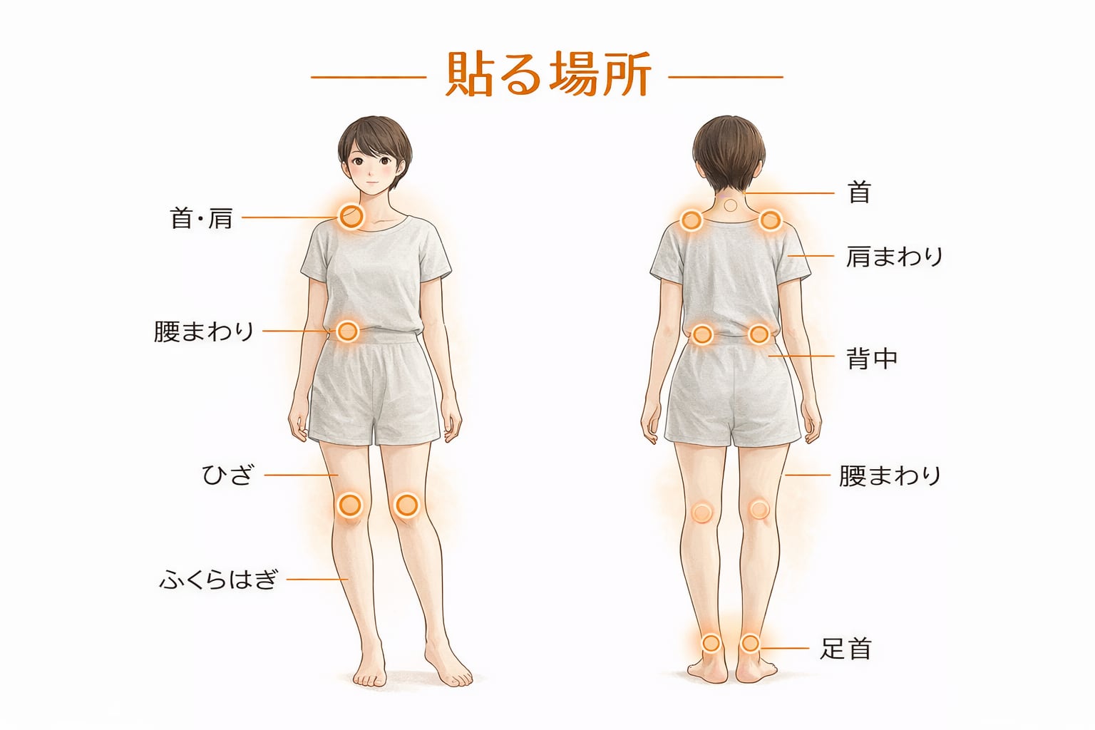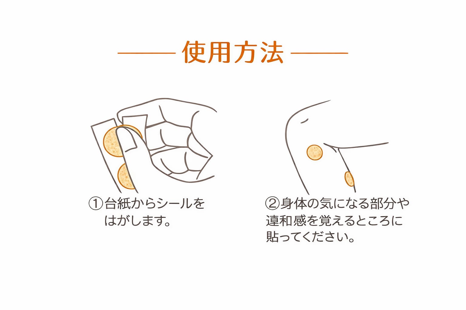 全身にお使い頂けます、肩、膝、腰などの気になる箇所、頭やお腹のお悩み箇所に貼ってください。